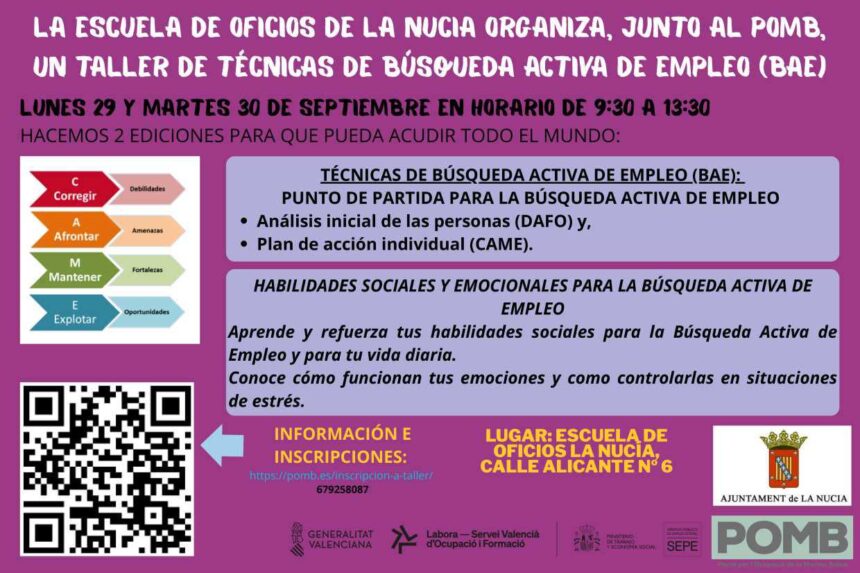 El próximo lunes 29 de septiembre comenzará en la Escuela de Oficios el curso de “Técnicas de búsqueda activa de empleo (BAE)”, de 9,30 a 13,30 horas. Tendrá una duración de dos jornadas: lunes y martes. El objetivo de esta formación es que el alumnado aprenda y refuerce las habilidades sociales para la búsqueda activa de empleo, conozca sus emociones y aprenda a controlarlas en situaciones de estrés. Inscripciones en : https://pomb.es/inscripcion-a-taller/