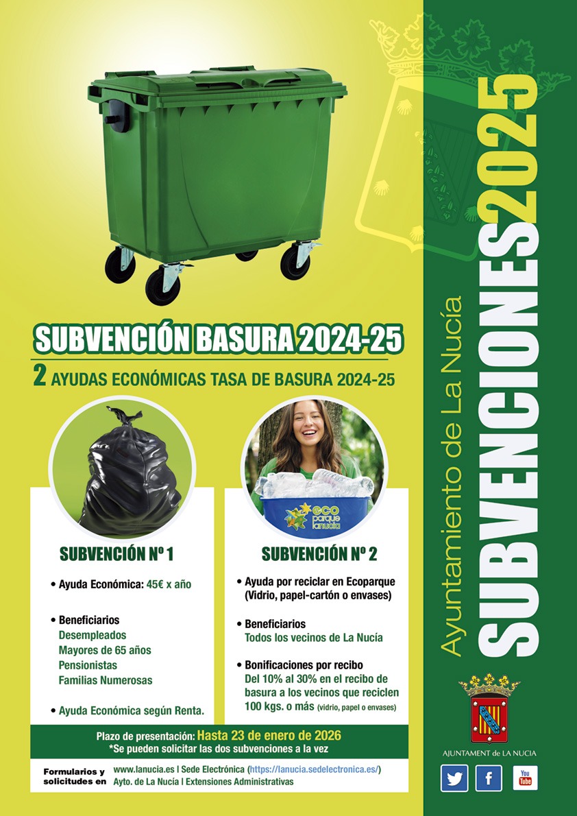 L@s vecin@s pueden solicitar las dos subvenciones de la basura en los años 2024 y 2025, ya que son compatibles y acumulativas. Las solicitudes podrán tramitarse online a través de la sede electrónica del Ayuntamiento de La Nucía (https://lanucia.sedelectronica.es) o físicamente en el Ayuntamiento y Extensiones Administrativas. El plazo de presentación de solicitudes para ambas subvenciones será hasta el 23 de enero de 2026.