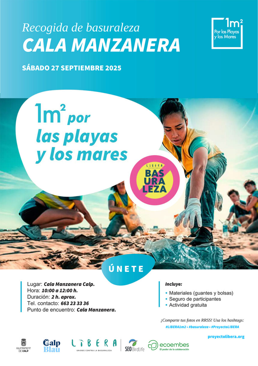 El próximo sábado 27 de septiembre, el Ayuntamiento de Calp se une a la campaña nacional “1m² por las playas y los mares” con una recogida de basuraleza en la Cala Manzanera. La iniciativa, enmarcada dentro del Proyecto LIBERA impulsado por SEO/BirdLife y Ecoembes, tiene como objetivo sensibilizar a la ciudadanía sobre el impacto de los residuos abandonados en los entornos naturales, especialmente en los espacios costeros.