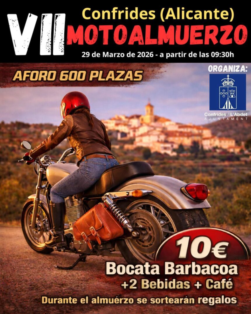 El Ayuntamiento de Confrides ha anunciado la celebración del VII Motoalmuerzo, que tendrá lugar el domingo 29 de marzo de 2026, una cita plenamente consolidada en el calendario motero tras el éxito registrado en ediciones anteriores.