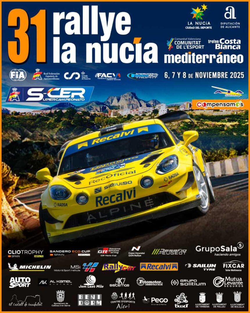 El 31 Rallye de La Nucía- Trofeo Costa Blanca se desarrollará esta semana los días 6, 7 y 8 de noviembre. Por décimo año la provincia de Alicante y La Nucía cuentan con una prueba del Supercampeonato de España de Rallyes (S-CER), que además será puntuable para el International Iberian Rally Trophy (IIRT) de la FIA y para el autonómico. Rallye que discurrirá por más de 30 municipios de montaña alicantina, con un total de 643 kilómetros, de los que 161 serán de competición en 12 espectaculares tramos. La Nucía será el cierre de la temporada del Supercampeonato de España de Rallyes, que contará con varios pilotos foráneos, entre los que destaca el noruego Andrea Mikklesen, que repite por segundo año, y el norirlandés Phillip Allen.