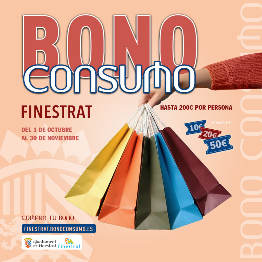 El Ayuntamiento activa un año más la campaña “Bono Consumo Finestrat”. Desde el miércoles 1 de octubre hasta el 30 de noviembre la ciudadanía empadronada en Finestrat y mayor de 18 años podrá adquirir a mitad de precio bonos de 10, 20 y 50€. La plataforma de bonos on line es http://finestrat.bonoconsumo.es/ y también se podrán conseguir de manera presencial en….
