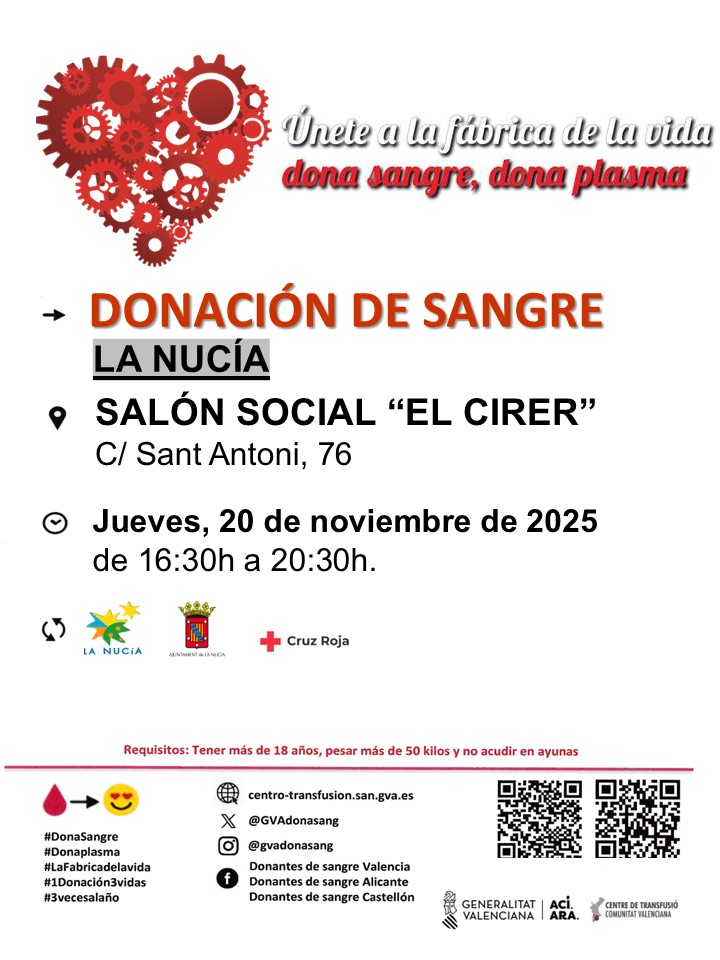 Recordemos que “la sangre no se puede fabricar” y que la única forma de obtenerla es mediante “la donación solidaria, voluntaria y altruista”. Una vez más el Ayuntamiento de La Nucía cederá el Salón Social El Cirer de forma gratuita al Centro de Transfusión de la Comunitat Valenciana en las donaciones programadas.