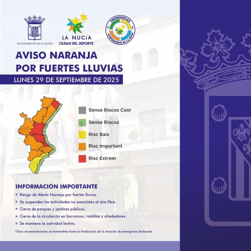 Hoy lunes 29 de septiembre el Ayuntamiento de La Nucía ha suspendido las actividades al aire libre y deportivas al aire libre, ha prohibido la circulación en barrancos, ramblas y alrededores y ha cerrado parques y jardines públicos por motivos de seguridad. El motivo de estas medidas es la “Alerta Naranja” por fuertes lluvias y tormentas decretada para hoy por el Centro de coordinación de Emergencias de la Generalitat (112 GVA), tras las predicciones de AEMET. Más información en https://www.112cv.gva.es/va/alertas-poblacion