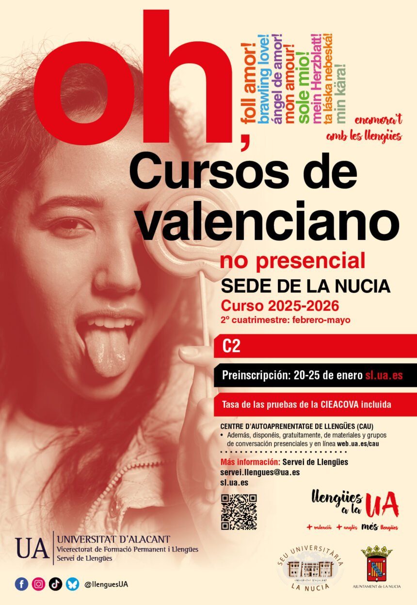 El próximo martes 20 de enero se abrirá el plazo de preinscripciones para el “Curs Superior de Valencià” (C2) de la Seu de La Nucía de la Universidad de Alicante, que se desarrollará en este segundo cuatrimestre del curso 2025-2026, de febrero a mayo en formato on-line. Las plazas son limitadas y las personas interesadas deben inscribirse en https://sl.ua.es/va/
