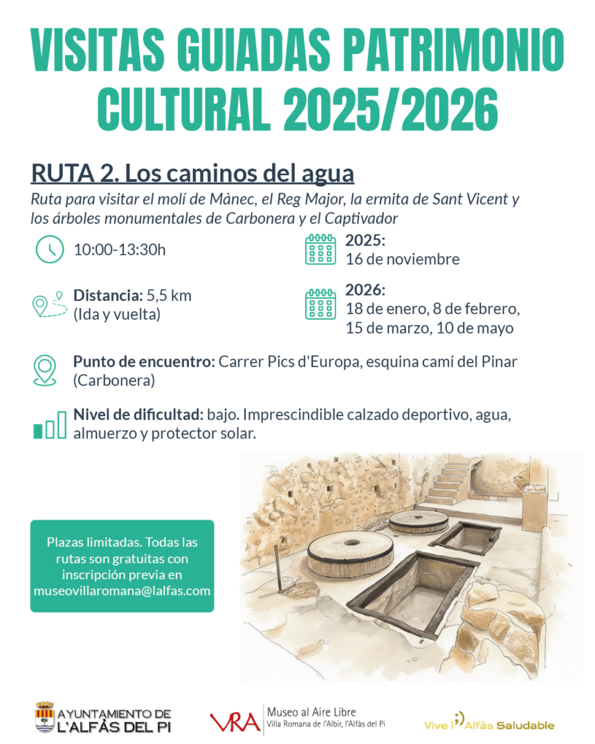 Continúa el programa de visitas guiadas gratuitas que desde el pasado mes de octubre impulsa la concejalía de Patrimonio Cultural del Ayuntamiento de l’Alfàs del Pi. El próximo domingo 18 de enero se ha programado una nueva actividad dentro de esta iniciativa: la ruta ‘Los caminos del agua’, que será la primera visita de Patrimonio Cultural de 2026.