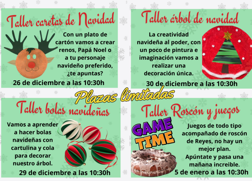 Juventud ha programado talleres matutinos, totalmente gratuitos, enfocados a niños y niñas de La Nucía. Se desarrollarán en el Centre Juvenil por las mañanas, a las 10,30 horas y tendrán la siguiente temática: el día 26 de diciembre Taller Caretas de Navidad, el 29 de diciembre Taller de Bolas Navideñas, el 30 de diciembre Taller de Árbol de Navidad y el 5 de enero Taller Roscón y Juegos.