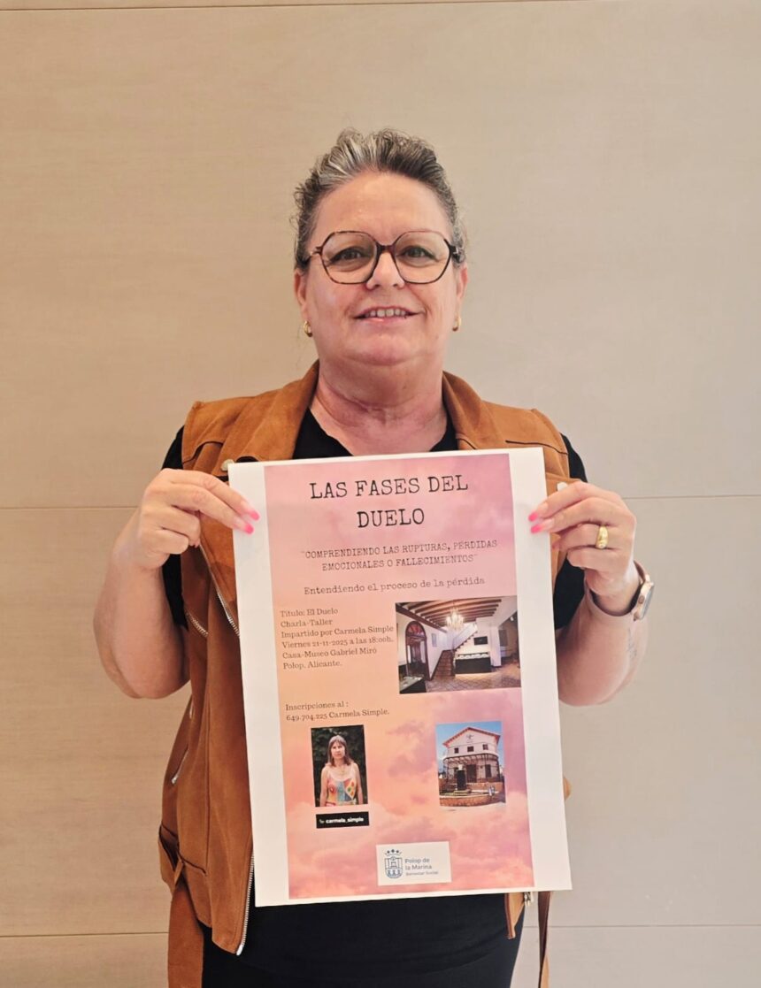 El Ayuntamiento de Polop de la Marina, a través de la concejalía de Bienestar Social, ha programado para el viernes 21 de noviembre una charla-taller sobre “El Duelo”, con el objetivo de ofrecer un espacio de reflexión y aprendizaje sobre la gestión emocional ante las distintas formas de pérdida. El encuentro se celebrará a las 18:00 horas en la Casa-Museo Gabriel Miró, y para asistir será necesaria la inscripción previa a través del teléfono o WhatsApp 649 704 225.