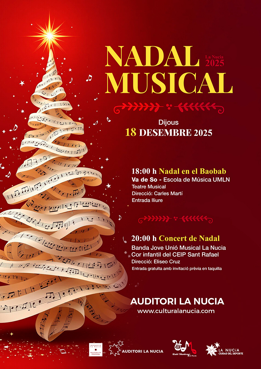 El “Nadal Musical” es doble en 2025, ya que habrá dos actuaciones el próximo jueves 18 de diciembre en l’Auditori de La Nucía. A las 18 horas se interpretará el teatro musical “Nadal en el Baobab” por Va de So- Escola de Música Unió Musical La Nucía y a las 20 horas será el tradicional “Concert de Nadal” de la Banda Jove de la Unió Musical La Nucía y el coro escolar del CEIP Sant Rafael. Las dos actuaciones tendrán entrada gratuita.